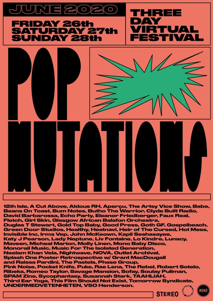 …12th Isle , A Cut Above, Aldous RH, Aperçu w/ LET GLASGOW FLOURISH, The Artsy Vice Show, Babe, Bum Notes Drag Karaoke w/ Ruby Waters, Butho The Warrior Clyde Built Radio, David Barbarossa, Double Discone, Echo Party, Eleanor Friedberger, Faux Real, Fletch, GIRL SKIN, GABO – Glasgow African Balafon Orchestra, The Flying Dug Quiz w/ Duglas T Stewart, Gold Top Baby, Good Press, GospelbeacH, Goth GF, THE GREEN DOOR STUDIO, HEALTHY in conversation with DJ Marcelle, Heatnavi, Heir of The Cursed, HOT MESS, Invisible, Inc., Irma Vep, John McKeown (Tyler Mckeown) presents: ‘You’ll Never Eat Koka Noodles in This Town Again’, JHM, Kapil Seshasayee, Katy J Pearson, Lady Neptune, Liv Fontaine, Lo Kindre, Lunacy, Maveen, Michael Marion, Molly Linen, Mono Baby Disco, monorail music, Mr Ben & The Bens presents “Beans On Toast’, Music for the isolated generation, Neelam Khan Vela, Nightwave, NOVA, Outlet Archival, The Pastels Films 1984-2013, PINK NOISE, Pocket Knife, Puke, Rae Lena, The Rebel, Robert Sotelo, Ribeka, Romeo Taylor, Savage Mansion, Sofay, Soulay Puliman, SPAM Zine, Splash One Poster Archives w/ Grant MacDougall and Raissa Pardini, Susannah Stark, Sycophantasy, TAAHLIAH, THIRD EAR -Yoga & Sound, This Film Should Not Exist – (Country Teasers film premiere), Tomorrow Syndicate, Undermedvetenheten, Vibeke Bruff, Vso Henderson
